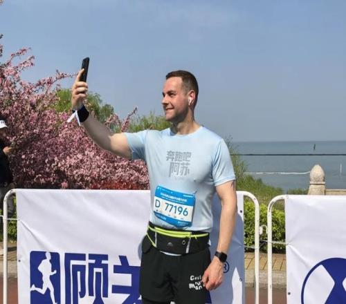 人群裏,有個身影格外醒目,他掏出手機,背對著太湖拍了張自拍,你或許已經認出來,這是西蒙(Simon)——那個上周在上海靜安跑完10公裏後,發視頻約跑友“太湖見”的丹麥人。