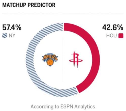北京時間4月1日,NBA常規賽迎來尼克斯與火箭的比賽。尼克斯此前喜提7連勝,不過期間對手都是實力不濟,這波連勝的含金量不足,而近兩場比賽先後輸給黃蜂和雷霆!目前他們48勝27負的戰績仍位列東部第3,領先身後的騎士隻有1個勝場。尼克斯去年雖然著重補強替補陣容,但依舊沒有改掉過度依賴主力陣容的毛病,上場打雷霆,首發拿到87分,替補僅僅拿了13分。而火箭這邊近期拿到2連勝,穩固了西部第六的位置,45勝29負的戰績與西部第五的森林狼相差0.5分勝場,火箭依舊有機會衝擊到西部第五的位置。賽前,ESPN預測火箭勝率隻有42.6%,尼克斯勝率高達57.4%。