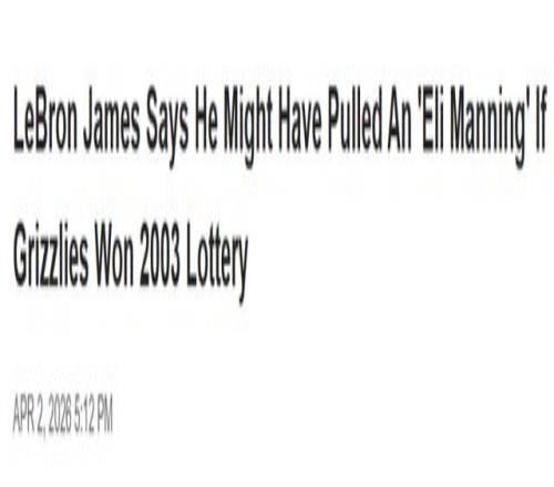 北京時間4月3日,勒布朗-詹姆斯表示,如果孟菲斯灰熊在2003年NBA選秀抽簽中抽中狀元簽,他可能會拒絕為灰熊效力,並將這種潛在的罷簽行為比作伊萊-曼寧在2004年NFL選秀中拒絕為聖地亞哥閃電隊出戰的做法。
