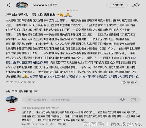 另外,張帥在飛抵奧地利林茨之後突然發現,自己的行李不見蹤影。經查詢發現,行李居然還在華盛頓,沒有隨機到達。比賽即將開打,張帥在多方聯係未果的情況下,無奈通過小紅書向奧地利國家旅遊局求助。截至目前,奧地利國家旅遊局已經回複收到,並正在處理中。