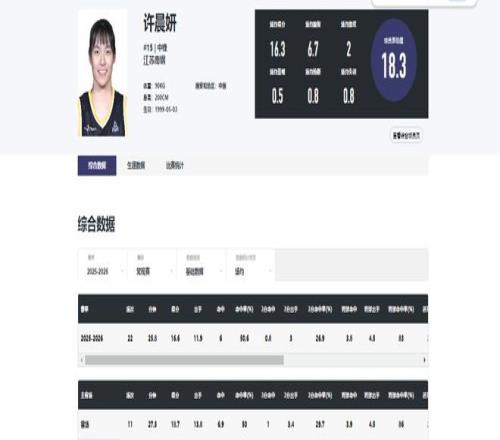 WCBA25-26賽季常規賽,她場均16.3分6.7籃板2助攻;季後賽三場過後,她場均14.3分3.7籃板,投籃、三分等命中率均可穩定在60%以上。要知道,同位置國手陳明伶、唐子婷本賽季的數據均沒有許晨妍出色。