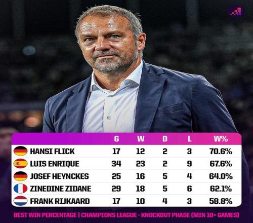 據統計,弗裏克總共帶領拜仁和巴薩征戰17場歐冠淘汰賽,取得12勝2平3負的優異戰績,這位德國教練是歐冠淘汰賽階段至少執教10場勝率最高的主教練。