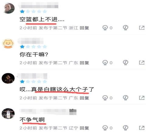 本輪遼寧以9分優勢擊敗福建的比賽中,吳昌澤替補出戰11分鍾,2中0,一分沒拿,全場僅有1個籃板。當初被視為“遼籃櫻木”的他,在剛上一隊的時候非常愛扣籃,但這場比賽,在有機會扣籃的情況下,吳昌澤卻並沒有選擇展現自己的彈跳能力。他這不爭氣的表現,也引起了球迷的吐槽:白瞎這麽大個子了。