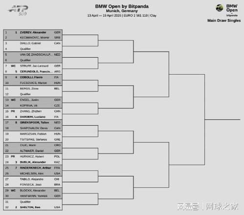 ATP500慕尼黑站:小茲維列夫、謝爾頓、布勃裏克、科博利作為前四號種子領銜。中國球員張之臻出戰,首輪對陣6號種子達爾德裏。