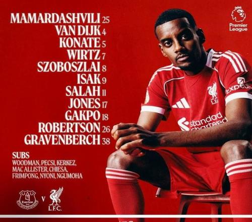 利物浦首發:25-馬馬爾達什維利、26-羅伯遜、4-範戴克、5-科納特、8-索博斯洛伊、17-瓊斯、38-赫拉芬貝赫、7-維爾茨、11-薩拉赫、9-伊薩克、18-加克波