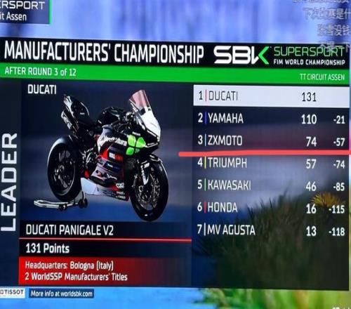 張雪機車在製造商積分榜上的積分是74分,排名第三。直播截圖