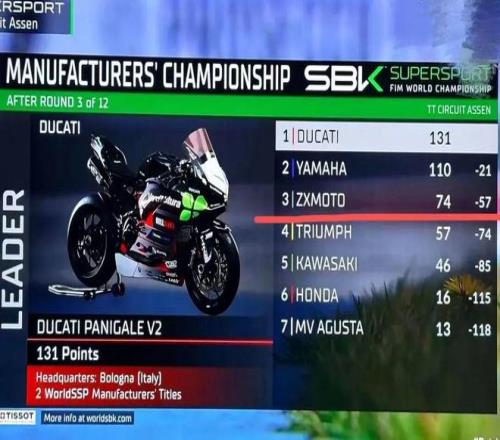 4月19日,在提前結束的世界超級摩托車錦標賽(WSBK)2026荷蘭站第二回合正賽中,中國摩托車品牌張雪機車的53號車手瓦倫丁·德比斯駕駛820RR-RS,取得第七名成績。截至目前,在WSBK製造商積分榜上,張雪機車的總積分位列第三名,僅落後於杜卡迪和雅馬哈。