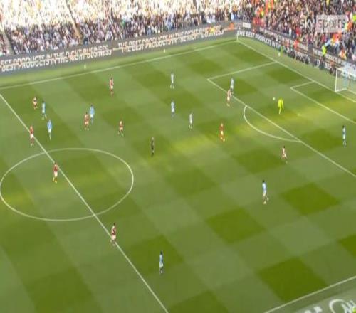 曼城這粒關鍵進球的過程是:多納魯馬手拋球找到左後衛尼科-奧賴利,後者帶球大步推進,利用大片空當前插。數秒後,奧賴利橫傳禁區,哈蘭德與加布裏埃爾對抗後左腳抽射,洞穿戴維-拉亞把守的球門。