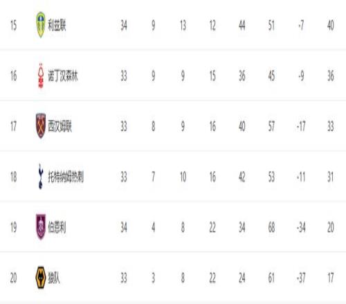 目前積分榜上,保級形勢可以用“絞殺”來形容。利茲聯34輪拿到40分,看似暫時安全,但其實仍未完全上岸;諾丁漢森林33輪36分,處於緩衝區卻暗流湧動;西漢姆聯33輪33分,正踩在生死線上;而最令人震驚的是,昔日英超勁旅托特納姆熱刺,33輪僅31分,已經跌入第18位的降級區。