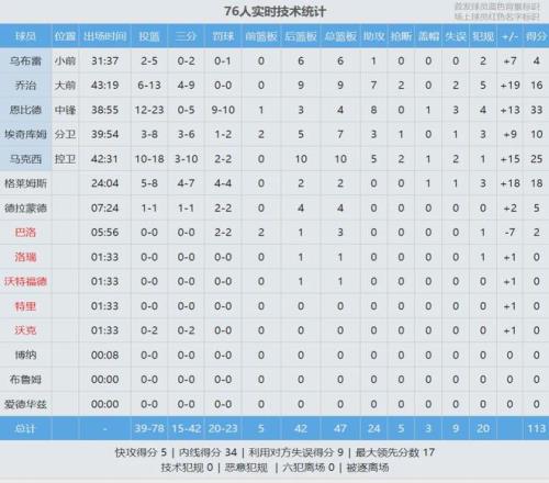 塔圖姆第四節2中0沒能得分,傑倫-布朗6中0,僅靠罰球拿到2分。雙探花被鎖死,凱爾特人大勢已去。全場結束,76人113-97逆轉凱爾特人,總比分追成2比3!恩比德33分4板8助,其中後三節爆砍29分!馬克西25分10板5助2斷。