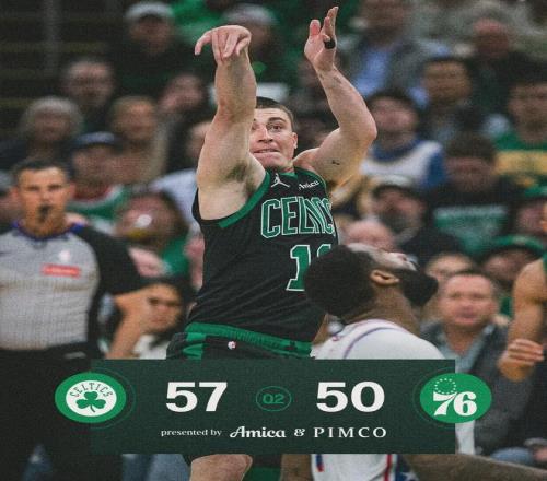 凱爾特人沒有協防,就讓恩比德1打1。大帝火力全開,第二節7投4中砍下11分。凱爾特人雙探花跟恩比德對飆,半場打完,凱爾特人57-50領先到7分。恩比德15分2板5助、馬克西13分4板;塔圖姆14分8板4助、布朗11分3板2助。