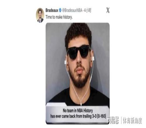 盡管目前大比分落後,但火箭隊上下卻信心滿滿。休斯頓記者Bradeaux發布圖文表示:“是時候創造曆史了。”配圖為申京的合成照片,原圖取自2016年總決賽騎士隊1-3落後勇士隊時,詹姆斯接受采訪的場景。圖中文字寫道:“在NBA曆史上,尚未有球隊能在0-3落後的情況下實現逆轉,戰績為0勝160負。